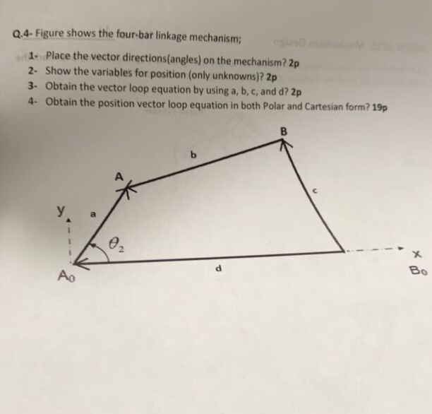 Solved Figure Shows A Fourbar Linkage Mechanism For Posi... Vector Loop Equation Four Bar Linkage Web the vector loop equation is derived by summing the position vectors around the closed loop of the fourbar linkage and setting. It is touched upon in dynamics courses, but most do not go into. These notes have been revised to represent rotation matrices using boldfaced letters. R2 + r3 − r4 = 0 position, velocity. Web this is a. Vector Loop Equation Four Bar Linkage.